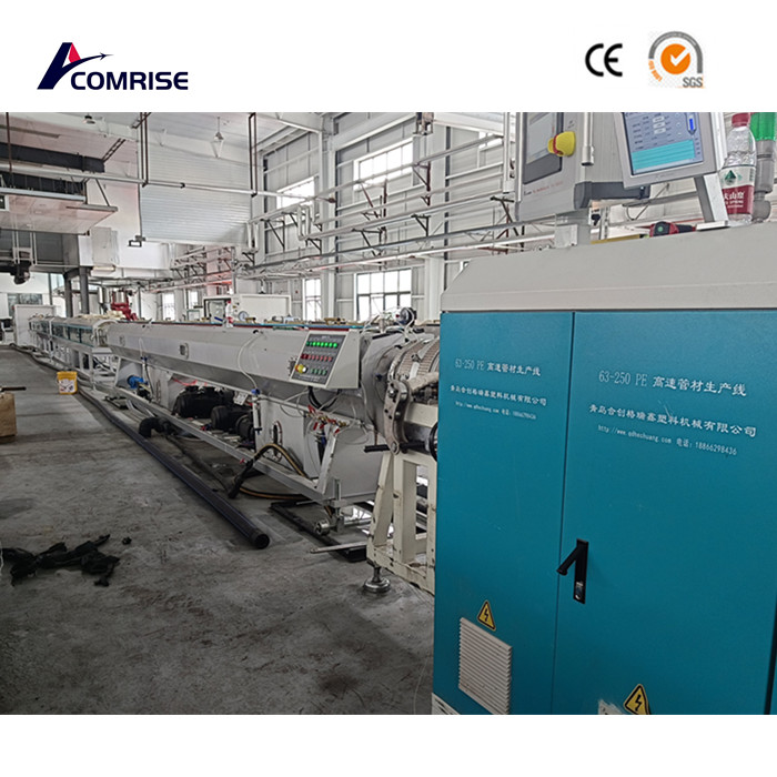 Enligt kundens specifika krav producerar Comrise Machinery 110mm HDPE -rörmaskinen med Siemens PLC och pekskärm för att styra hela maskinen. Det finns också mätarvikt Auto Control System. Den här enheten garanterar PE -röret med exakt väggtjocklek efter behov. Extrudern är SJ65/33 med 55 kW AC -motor.