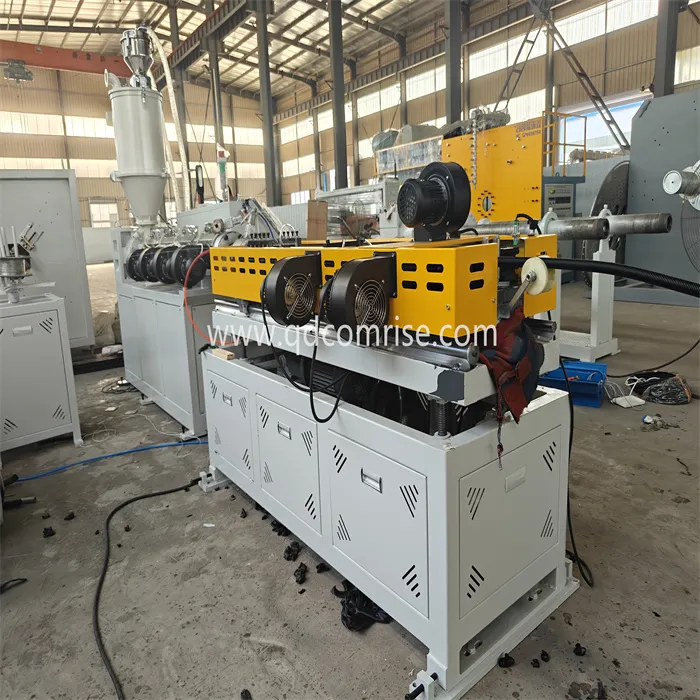 Röret kommer in i korrugatorn, där den formas till en korrugerad profil med mögelblock och vakuumtryck.